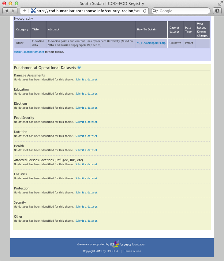 On Tuesday, July 3rd, the DHNetwork proposed that the SBTF be the Solution Team for this activation request. The SBTF was subsequently activated in partnership with OCHA. This was an interesting deployment for the SBTF, since it was essentially an exercise in crowdsourcing the curation of information - finding data online and providing it in a standard format to render it easily usable by OCHA. Volunteers were asked to search for data on population, displacement, returnees, refugees, security incidents, schools, water sources, health facilities and economic constraints - all aggregated at the county and state levels. The screenshot below (of OCHA’s online data repository) shows how little was available to the OCHA team prior to their field visit: